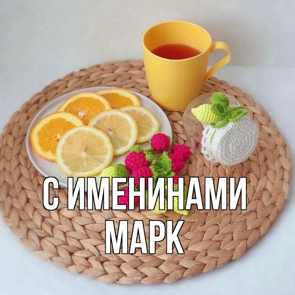 Открытка С именинами Марк. чай и лимон. вязаные штучки