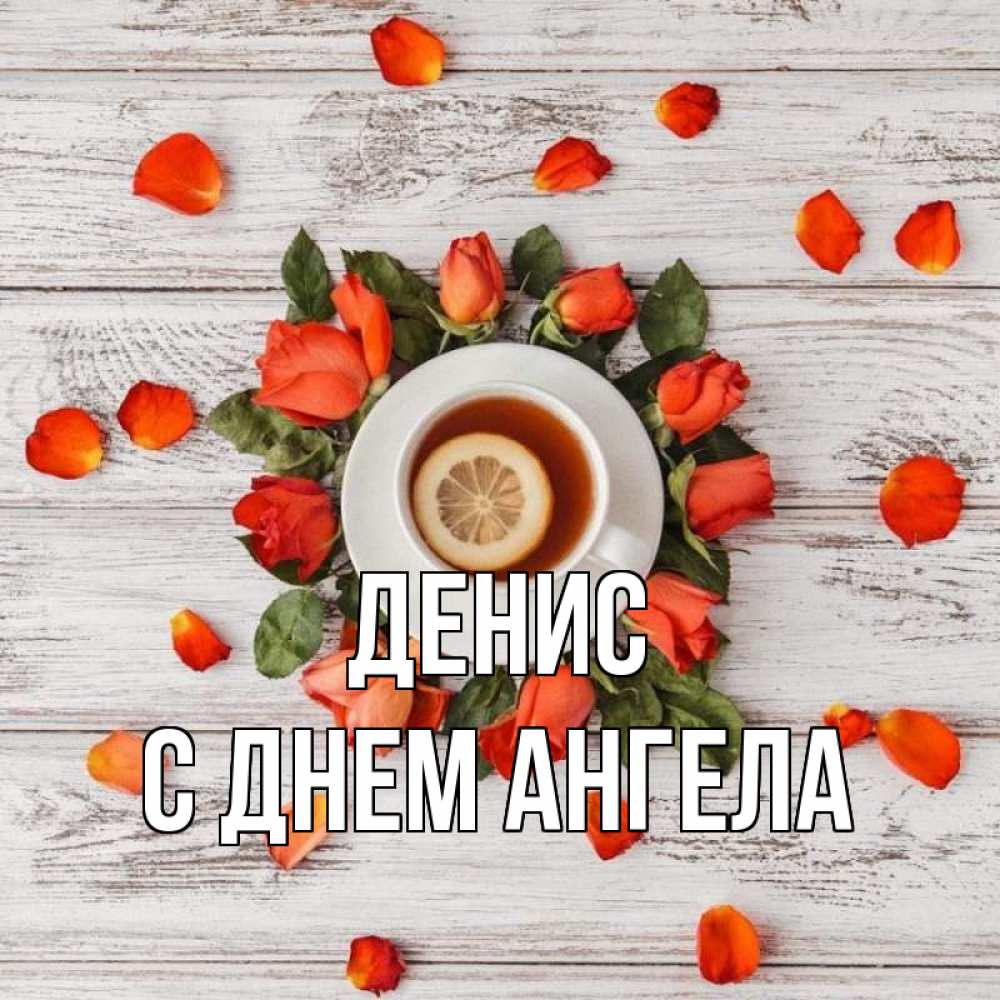 Открытка Денис С днем ангела. лепестки роз и чай с лимоном. фон из досок