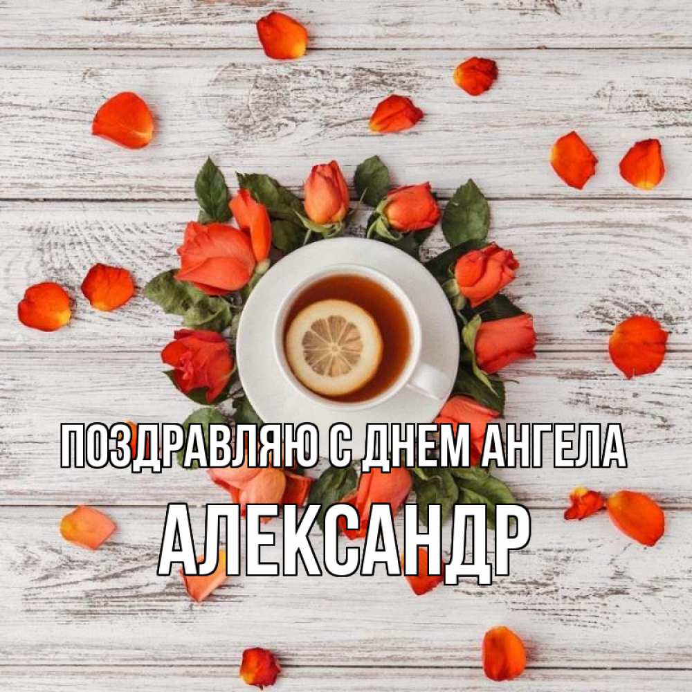 Открытка Поздравляю с днем Ангела Александр. лепестки роз и чай с лимоном. фон из досок