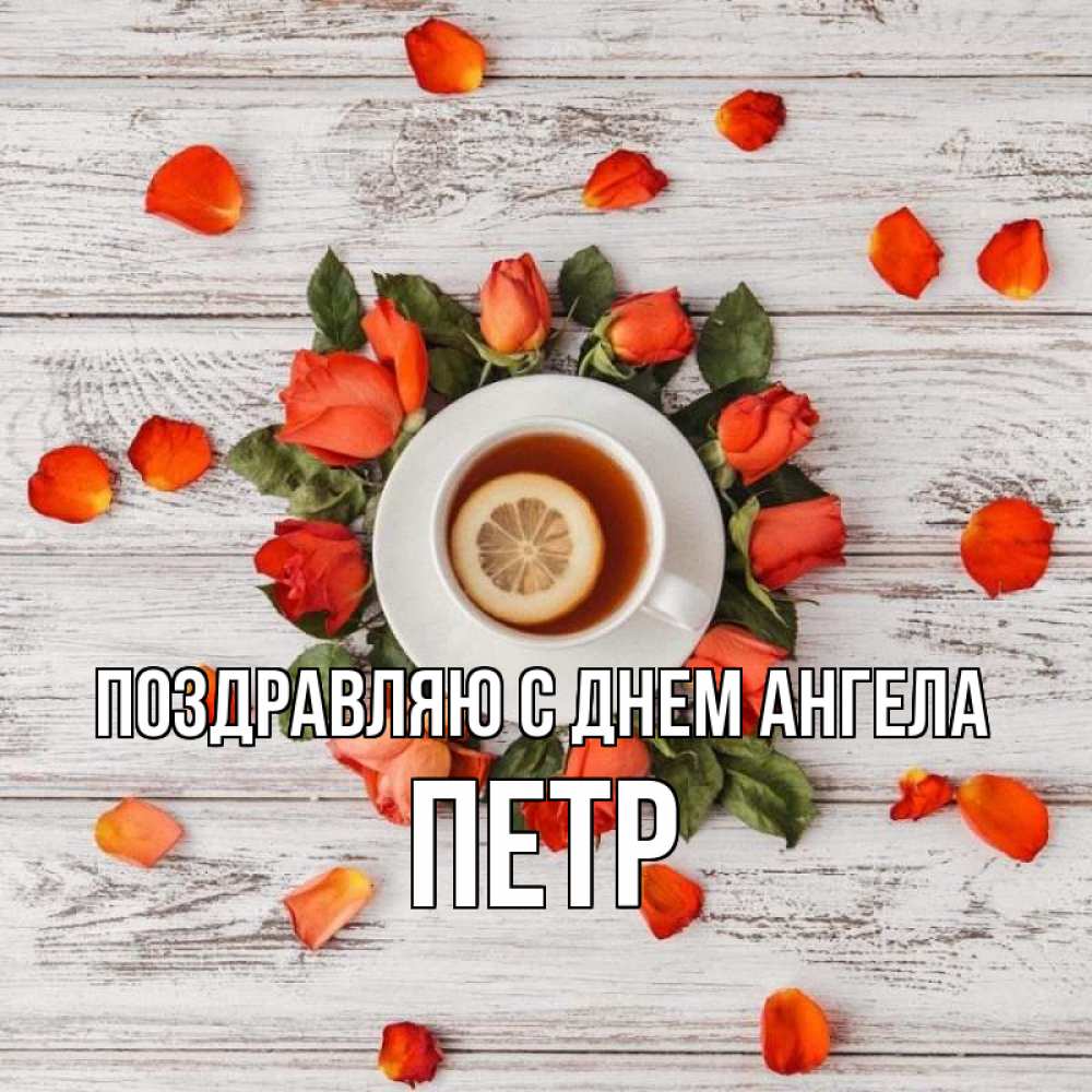 Открытка Поздравляю с днем Ангела Петр. лепестки роз и чай с лимоном. фон из досок