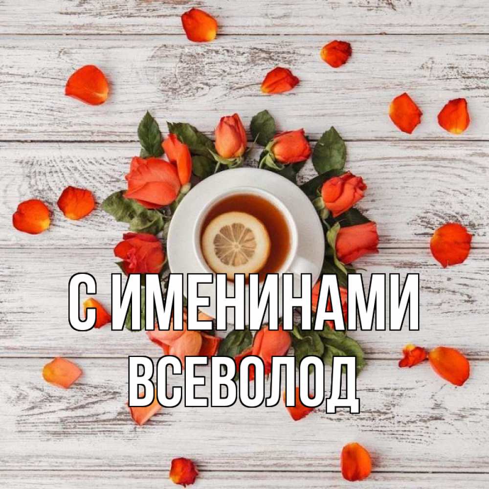 Открытка С именинами Всеволод. лепестки роз и чай с лимоном. фон из досок
