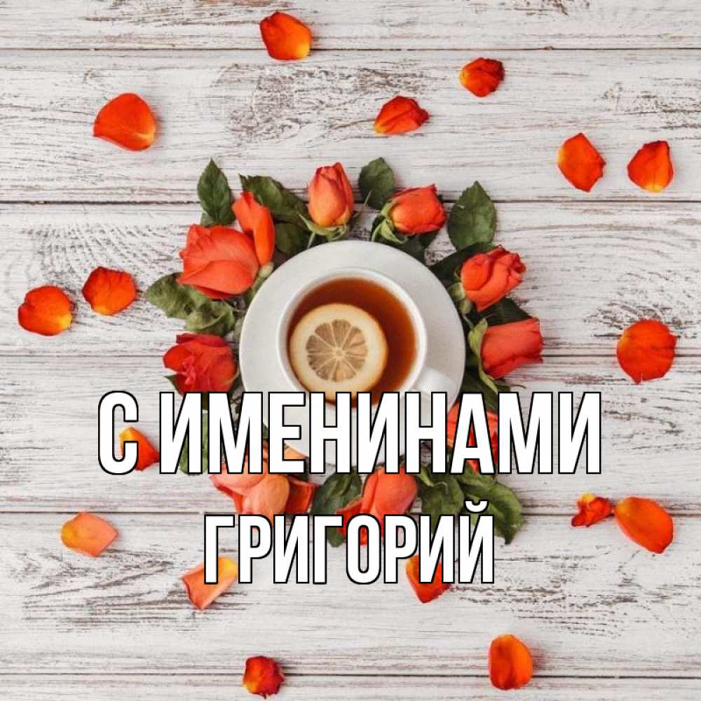 Открытка С именинами Григорий. лепестки роз и чай с лимоном. фон из досок