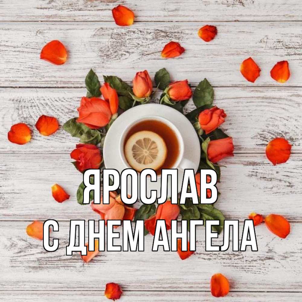 Открытка Ярослав С днем ангела. лепестки роз и чай с лимоном. фон из досок