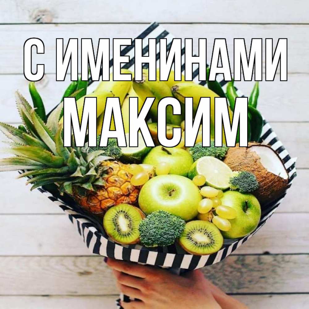 Открытка С именинами Максим. фруктовый букет. киви ананас кокос и бананы