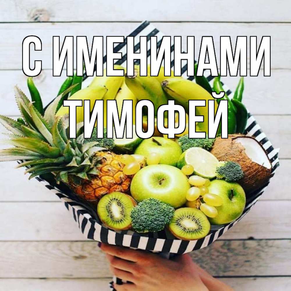 Открытка С именинами Тимофей. фруктовый букет. киви ананас кокос и бананы