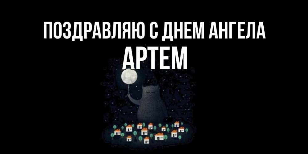 Открытка Поздравляю с днем Ангела Артем. кот освещает город луной. кот,луна, ночь, звезды