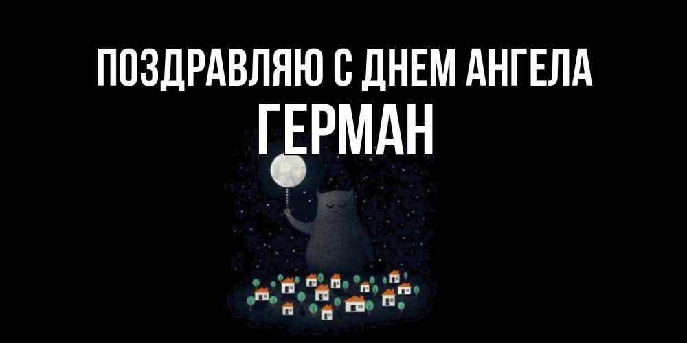 Открытка Поздравляю с днем Ангела Герман. кот освещает город луной. кот,луна, ночь, звезды