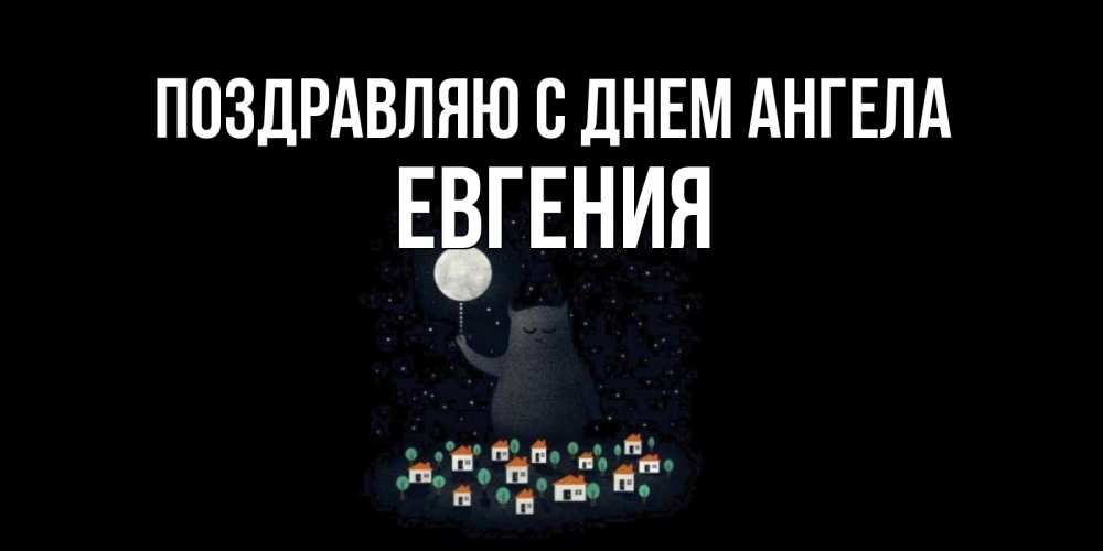 Открытка Поздравляю с днем Ангела Евгения. кот освещает город луной. кот,луна, ночь, звезды