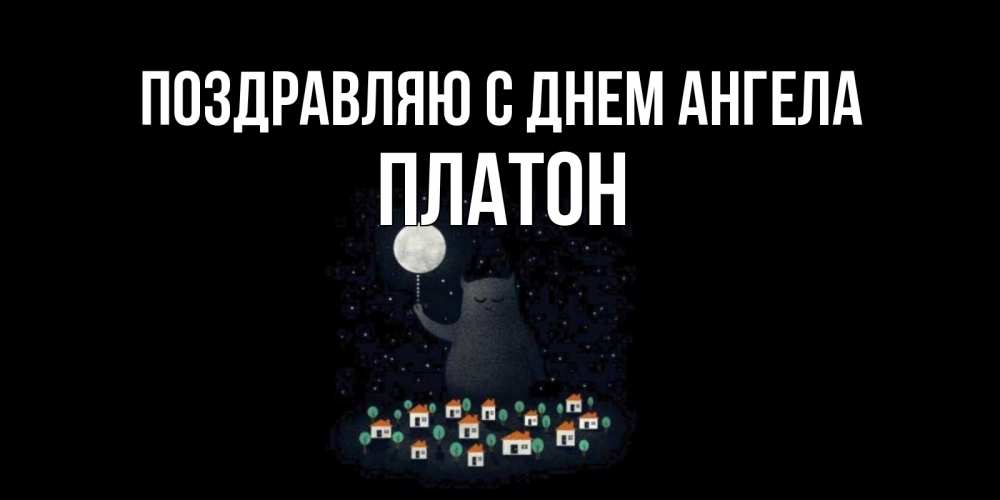 Открытка Поздравляю с днем Ангела Платон. кот освещает город луной. кот,луна, ночь, звезды