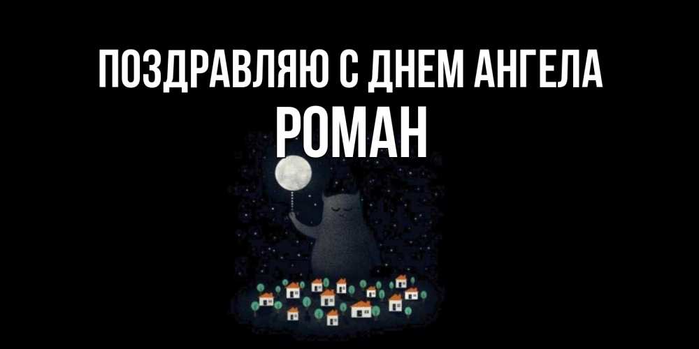 Открытка Поздравляю с днем Ангела Роман. кот освещает город луной. кот,луна, ночь, звезды