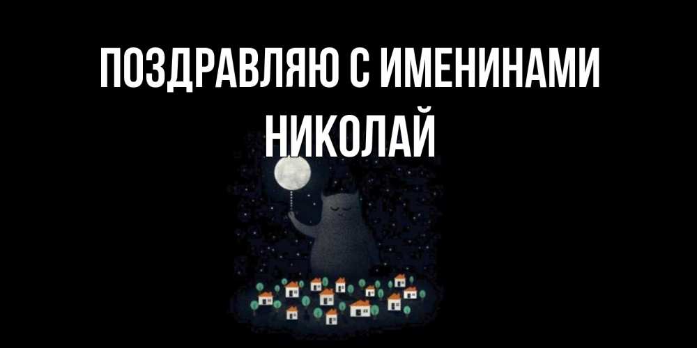 Открытка Поздравляю с именинами Николай. кот освещает город луной. кот,луна, ночь, звезды