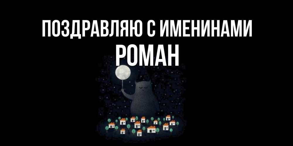 Открытка Поздравляю с именинами Роман. кот освещает город луной. кот,луна, ночь, звезды