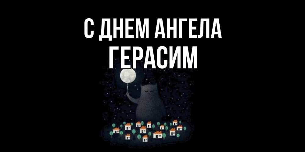 Открытка С днем Ангела Герасим. кот освещает город луной. кот,луна, ночь, звезды