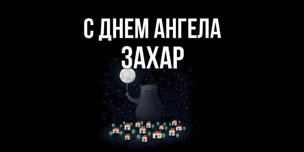 Открытка С днем Ангела Захар. кот освещает город луной. кот,луна, ночь, звезды