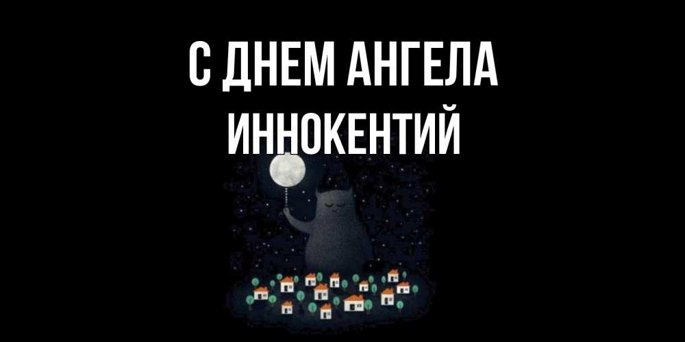 Открытка С днем Ангела Иннокентий. кот освещает город луной. кот,луна, ночь, звезды