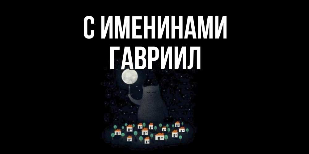Открытка С именинами Гавриил. кот освещает город луной. кот,луна, ночь, звезды