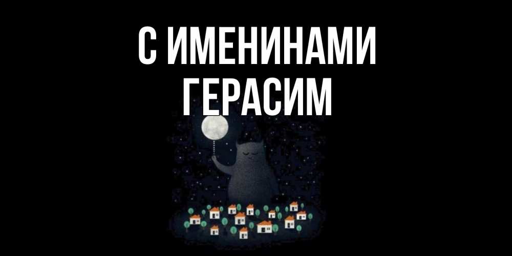 Открытка С именинами Герасим. кот освещает город луной. кот,луна, ночь, звезды