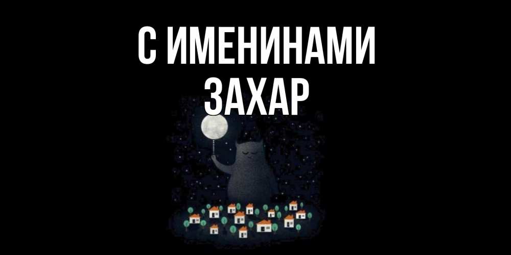 Открытка С именинами Захар. кот освещает город луной. кот,луна, ночь, звезды