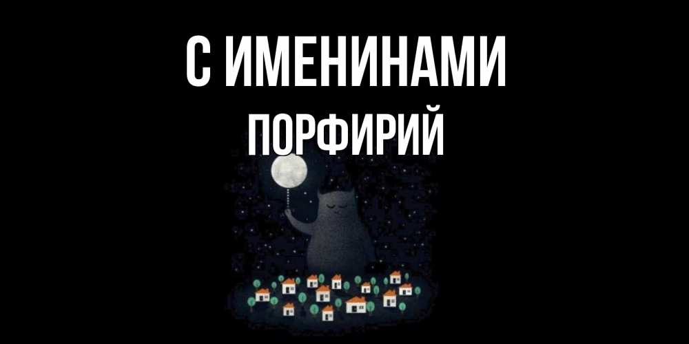 Открытка С именинами Порфирий. кот освещает город луной. кот,луна, ночь, звезды