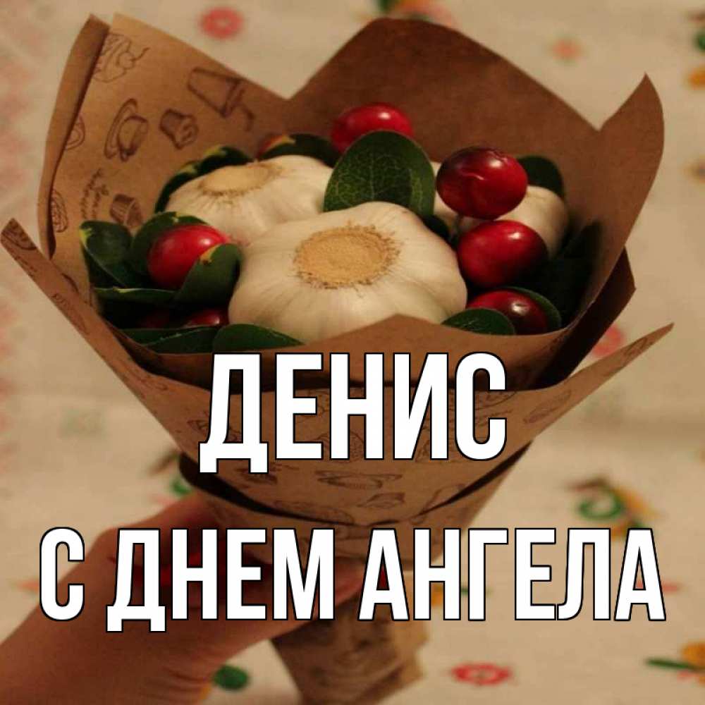 Открытка Денис С днем ангела. чеснок и клюква. букет из фитонцидов и витамина c
