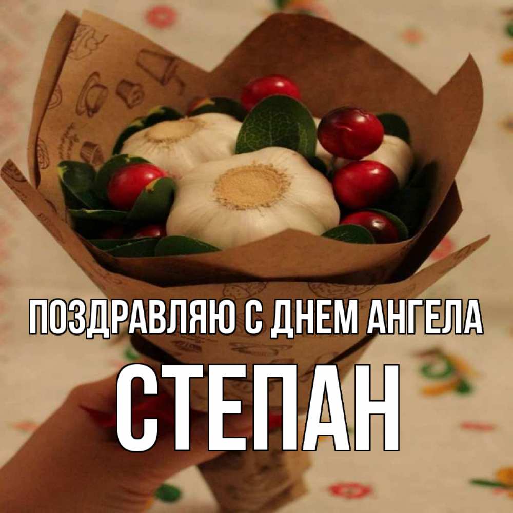 Открытка Поздравляю с днем Ангела Степан. чеснок и клюква. букет из фитонцидов и витамина c