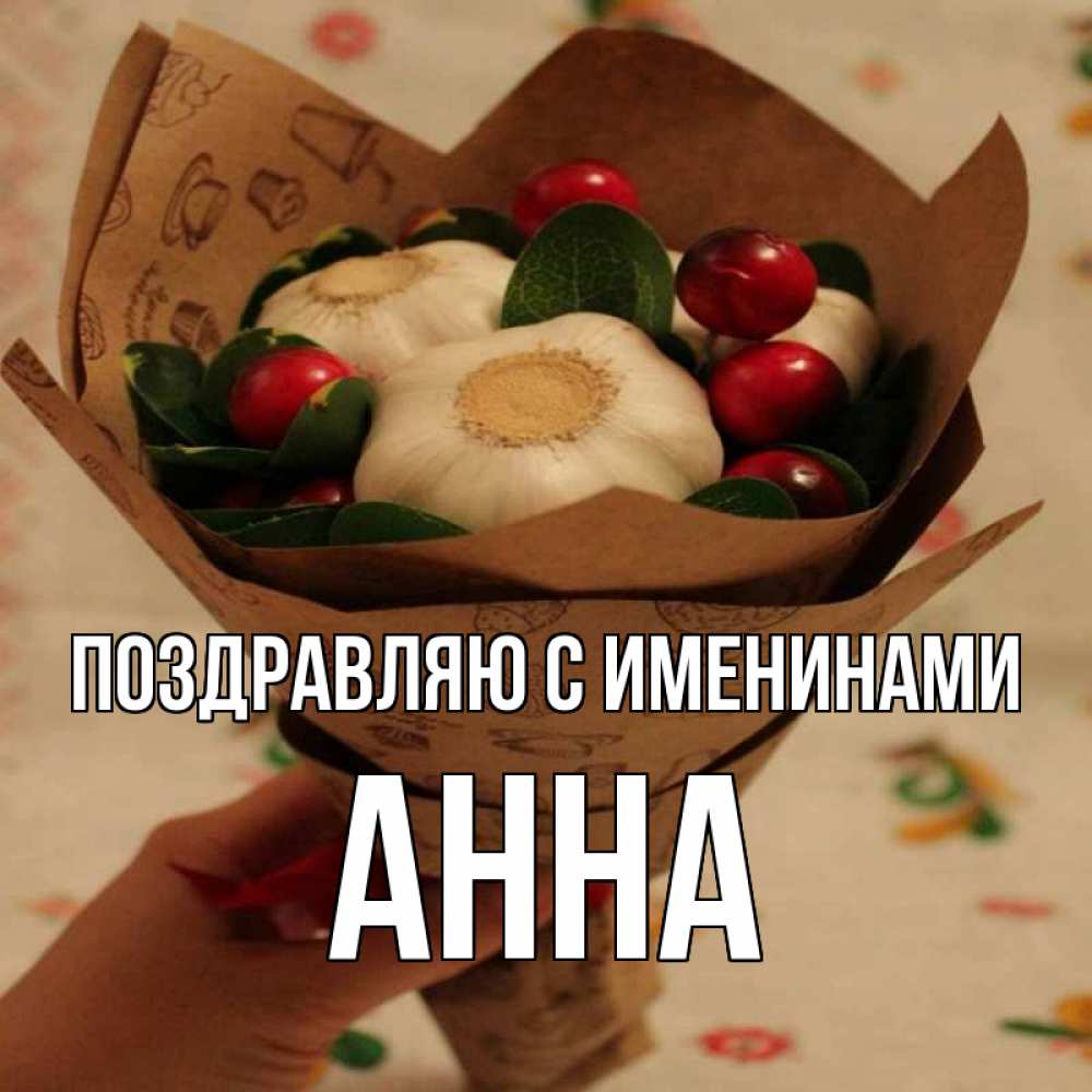 Открытка Поздравляю с именинами Анна. чеснок и клюква. букет из фитонцидов и витамина c