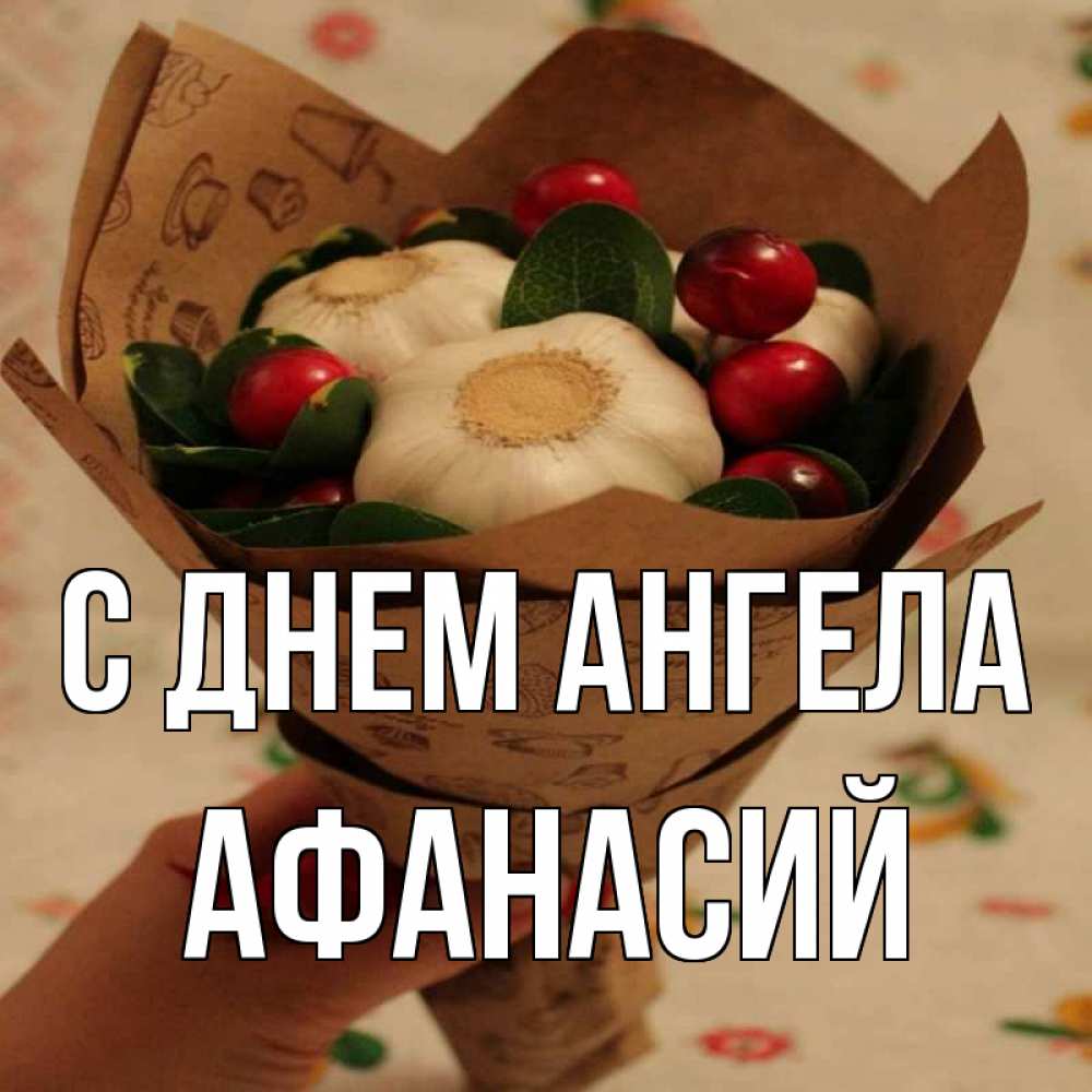 Открытка С днем Ангела Афанасий. чеснок и клюква. букет из фитонцидов и витамина c