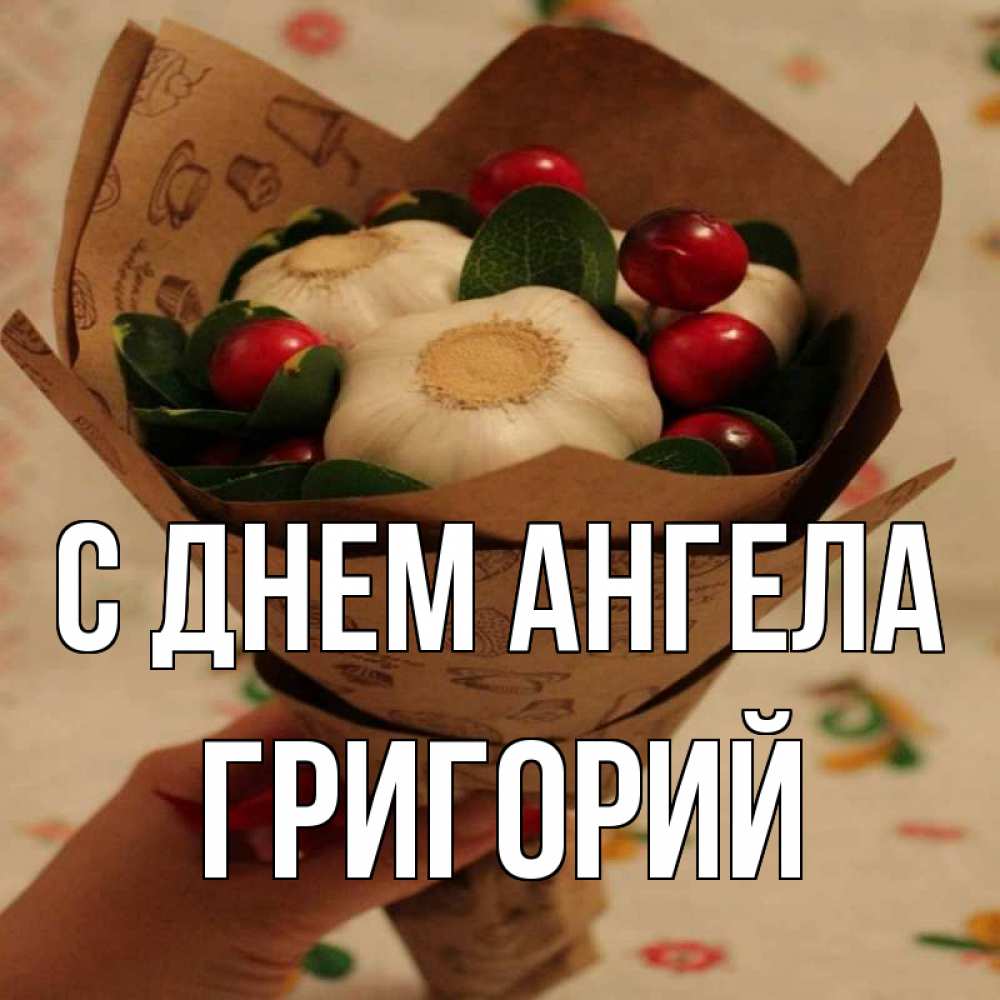 Открытка С днем Ангела Григорий. чеснок и клюква. букет из фитонцидов и витамина c