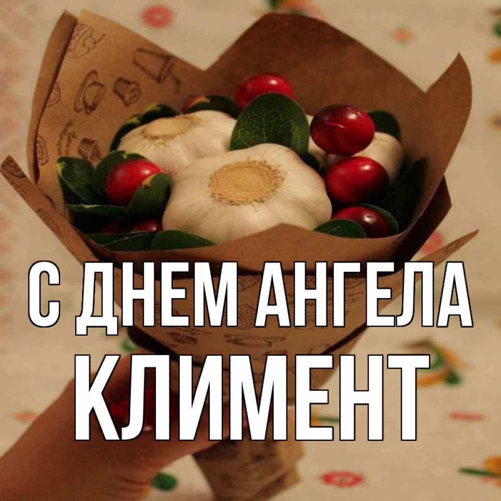Открытка С днем Ангела Климент. чеснок и клюква. букет из фитонцидов и витамина c