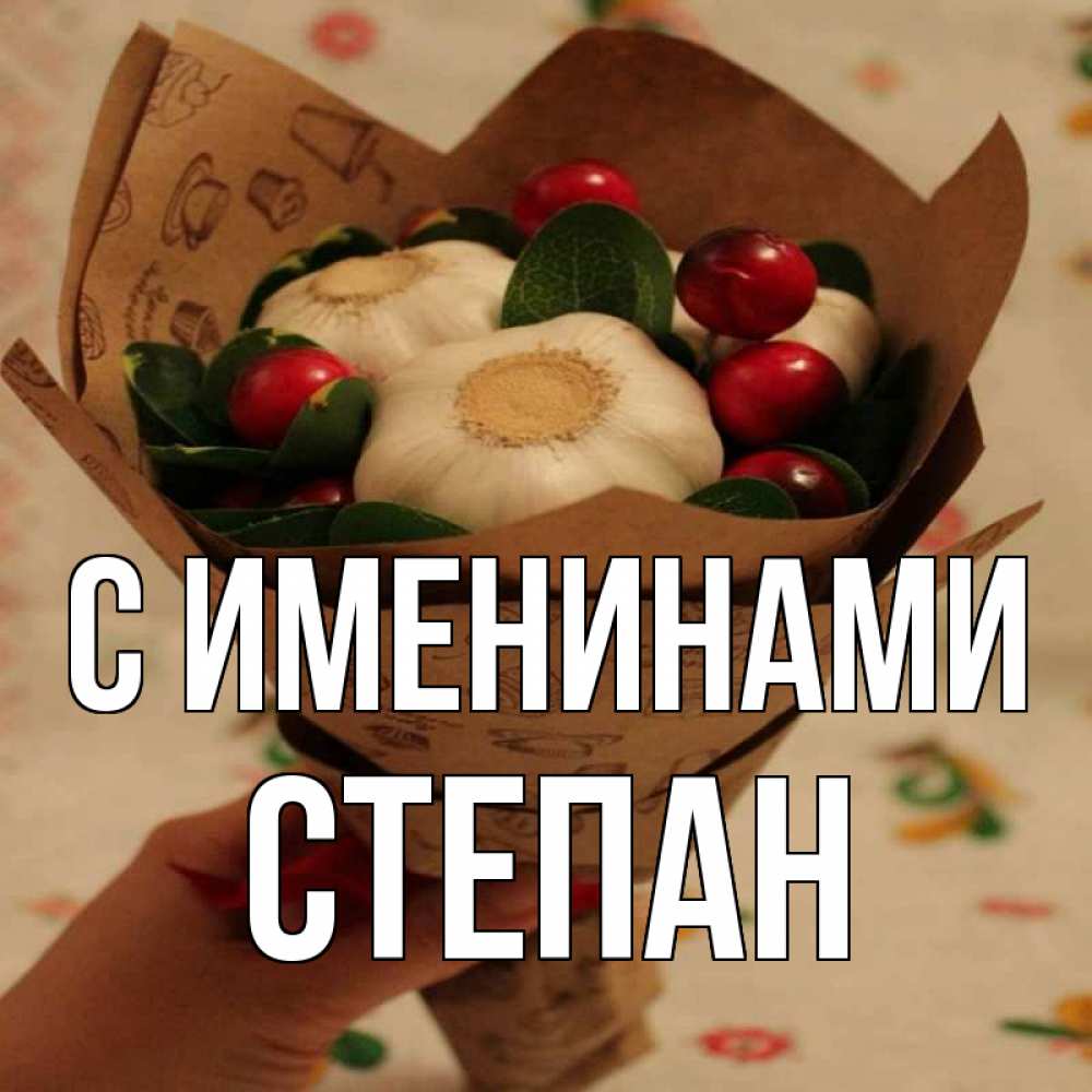 Открытка С именинами Степан. чеснок и клюква. букет из фитонцидов и витамина c
