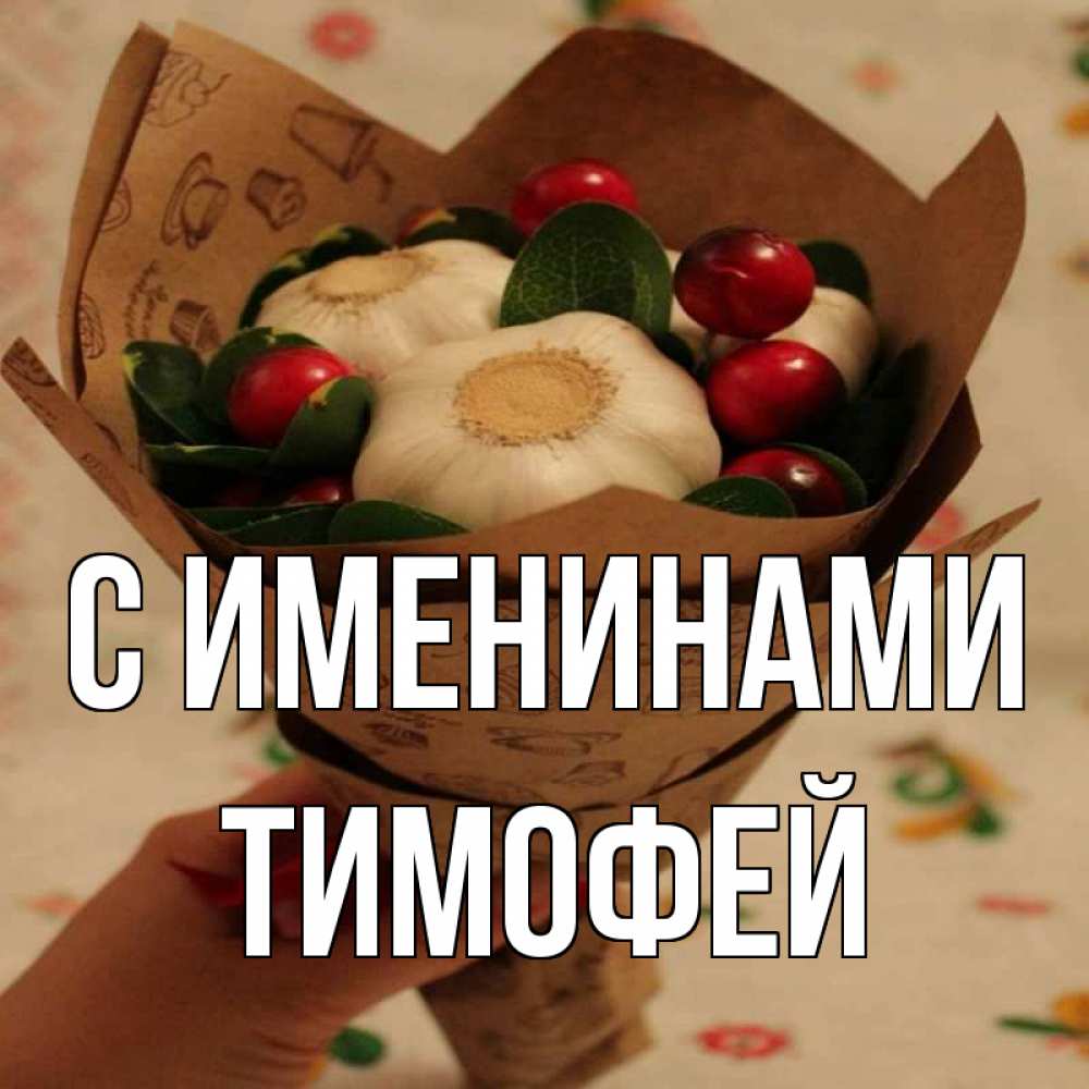 Открытка С именинами Тимофей. чеснок и клюква. букет из фитонцидов и витамина c