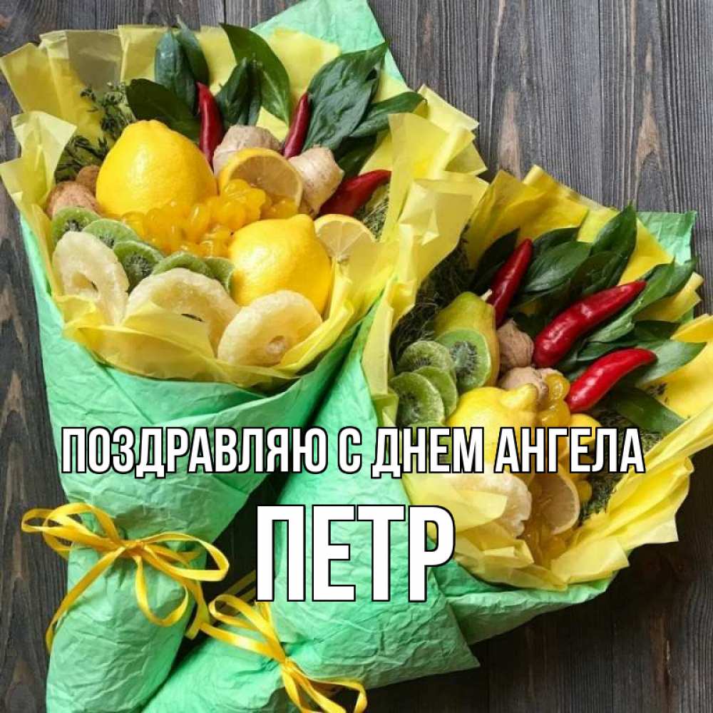 Открытка Поздравляю с днем Ангела Петр. два полезных букета. для скорейшего выздоровления