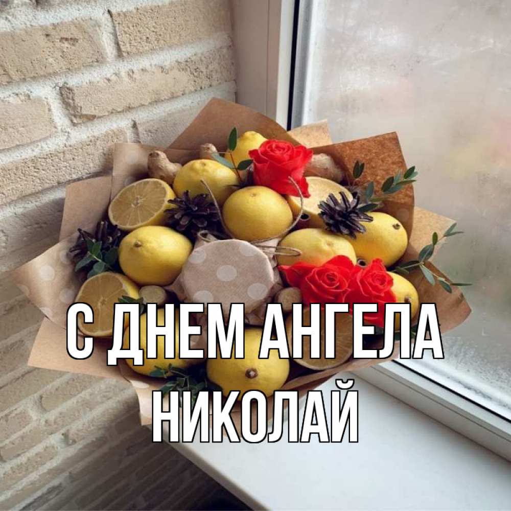 Открытка С днем Ангела Николай. лимоны и розы. букет в бумаге