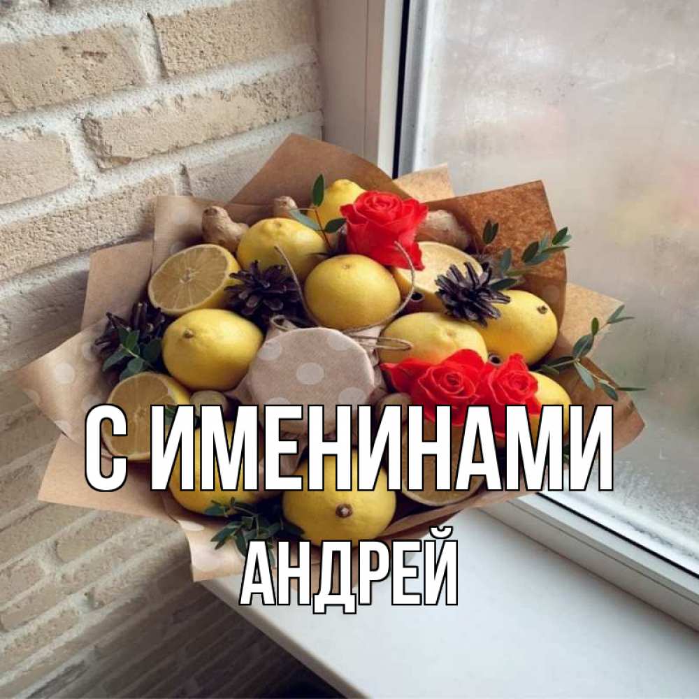Открытка С именинами Андрей. лимоны и розы. букет в бумаге