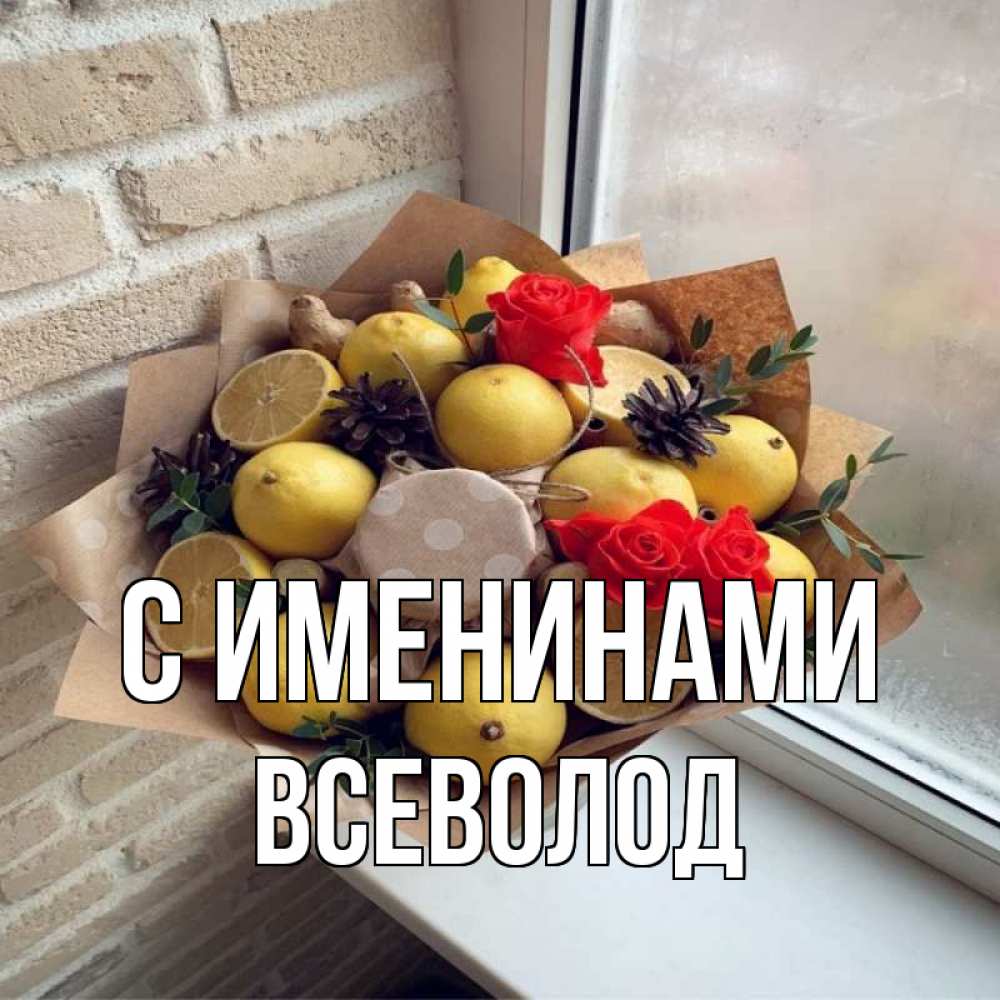 Открытка С именинами Всеволод. лимоны и розы. букет в бумаге