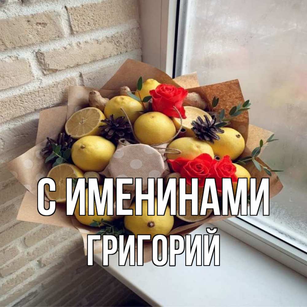Открытка С именинами Григорий. лимоны и розы. букет в бумаге