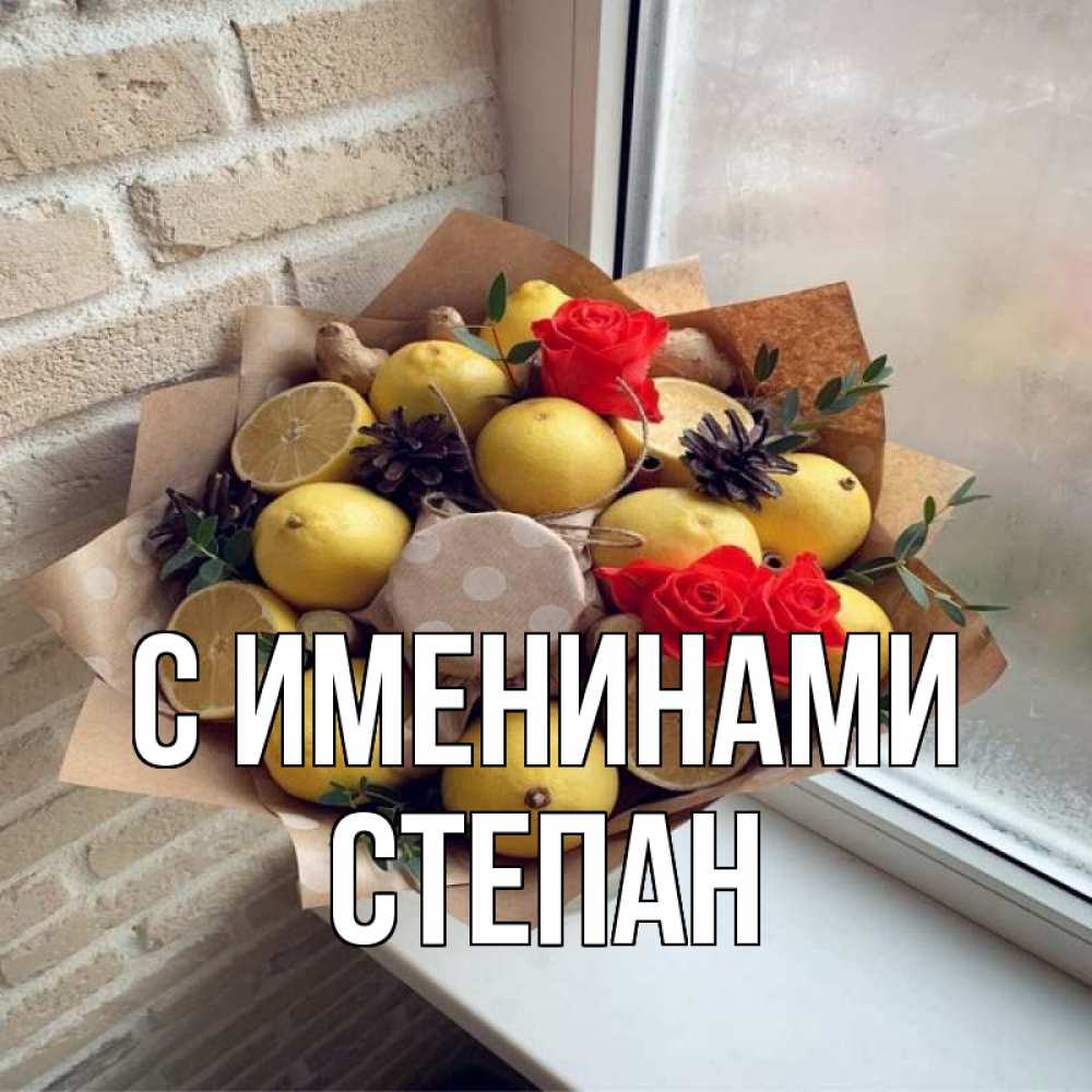 Открытка С именинами Степан. лимоны и розы. букет в бумаге