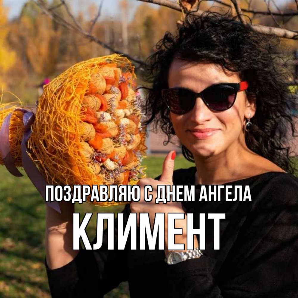 Открытка Поздравляю с днем Ангела Климент. страшная тетка рекомендуете не болеть. что то там у нее в букете