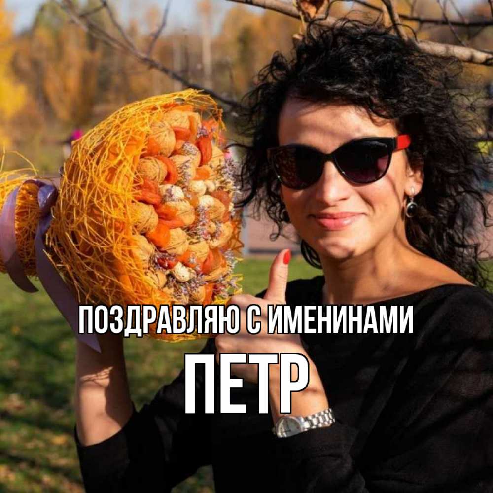 Открытка Поздравляю с именинами Петр. страшная тетка рекомендуете не болеть. что то там у нее в букете