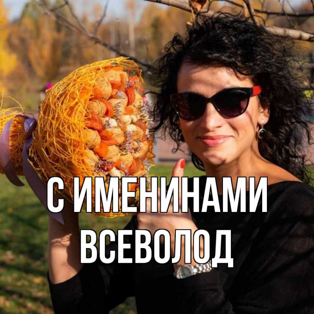 Открытка С именинами Всеволод. страшная тетка рекомендуете не болеть. что то там у нее в букете