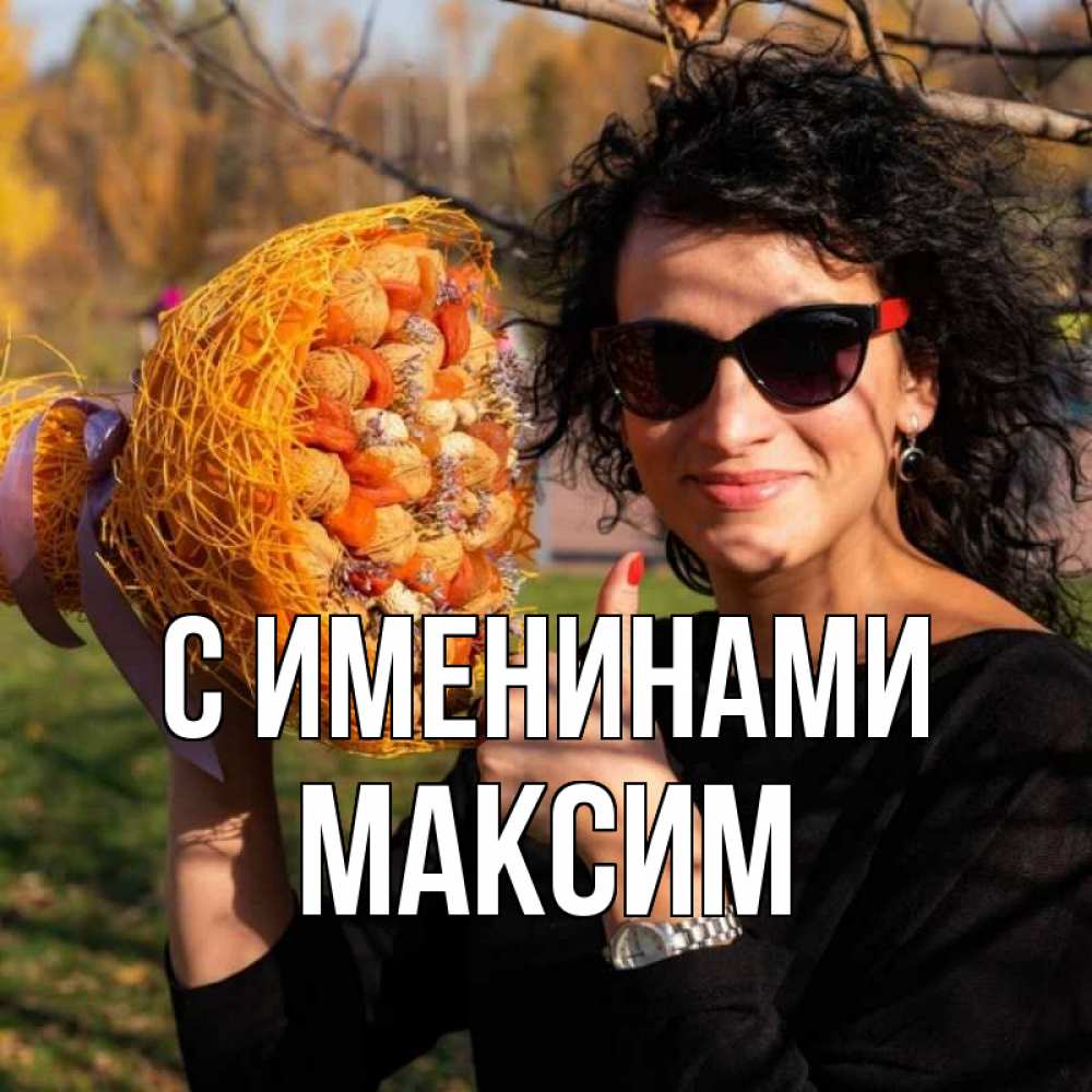 Открытка С именинами Максим. страшная тетка рекомендуете не болеть. что то там у нее в букете