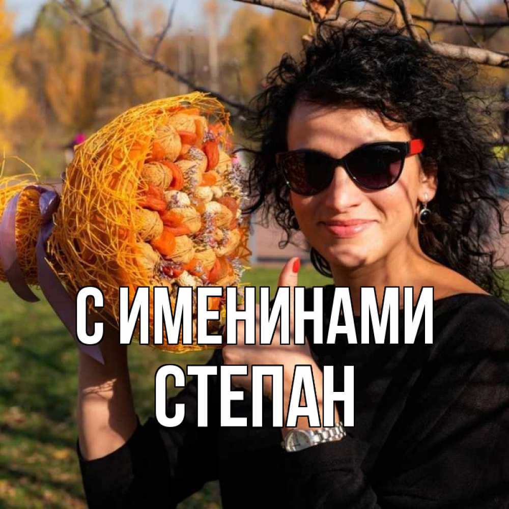 Открытка С именинами Степан. страшная тетка рекомендуете не болеть. что то там у нее в букете