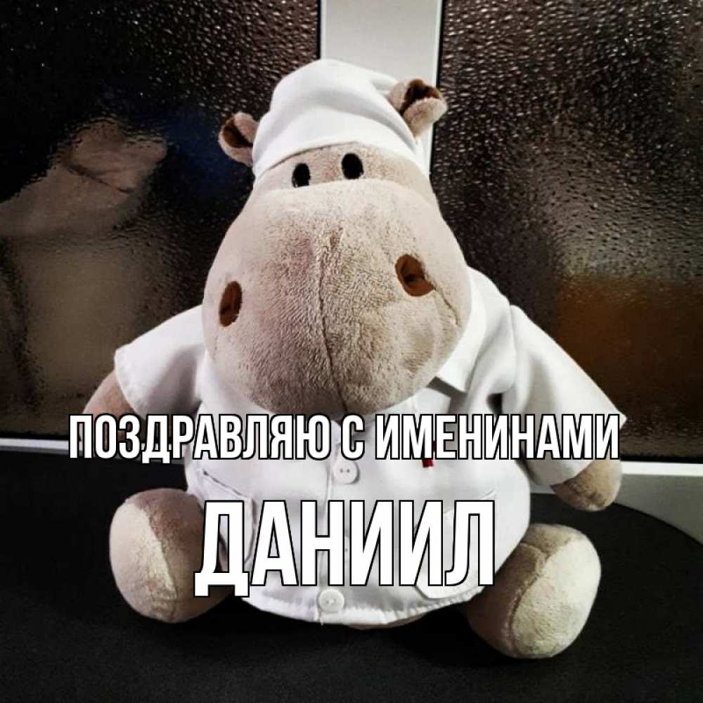 Открытка Поздравляю с именинами Даниил. бегемотик спешит на помощь. всех излечит исцелит