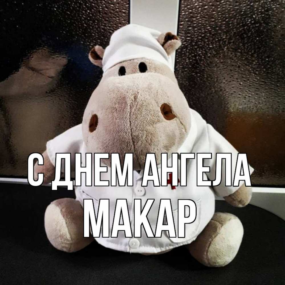Открытка С днем Ангела Макар. бегемотик спешит на помощь. всех излечит исцелит