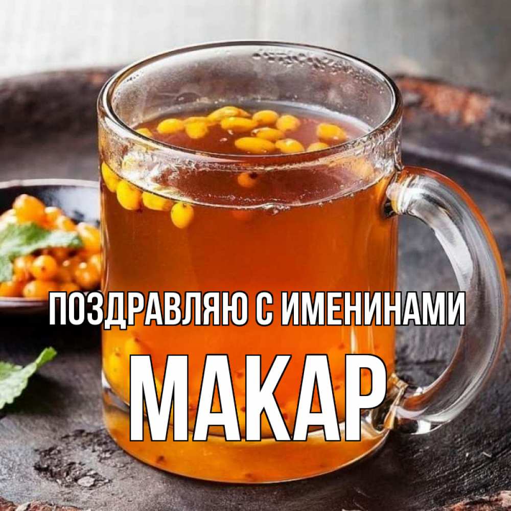 Открытка Поздравляю с именинами Макар. облепиховый чай. лекарство от простуды