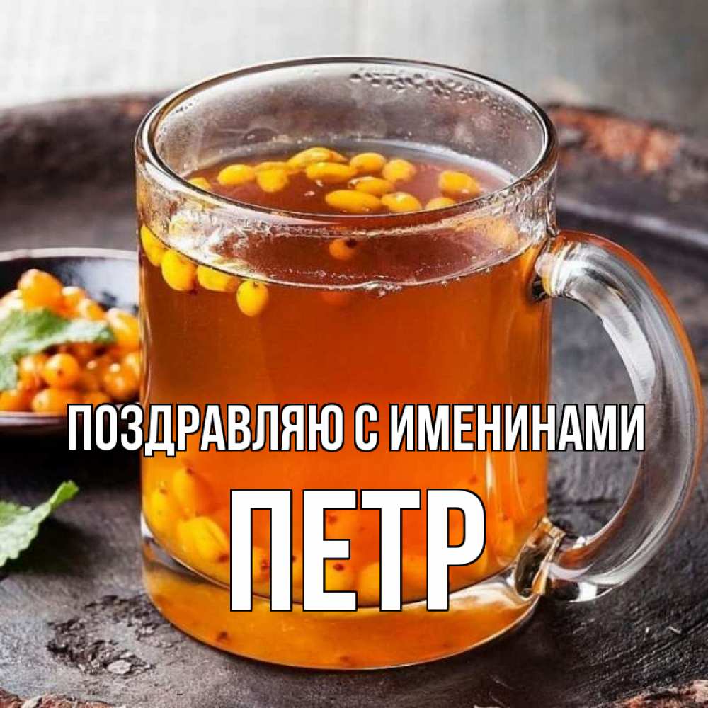 Открытка Поздравляю с именинами Петр. облепиховый чай. лекарство от простуды