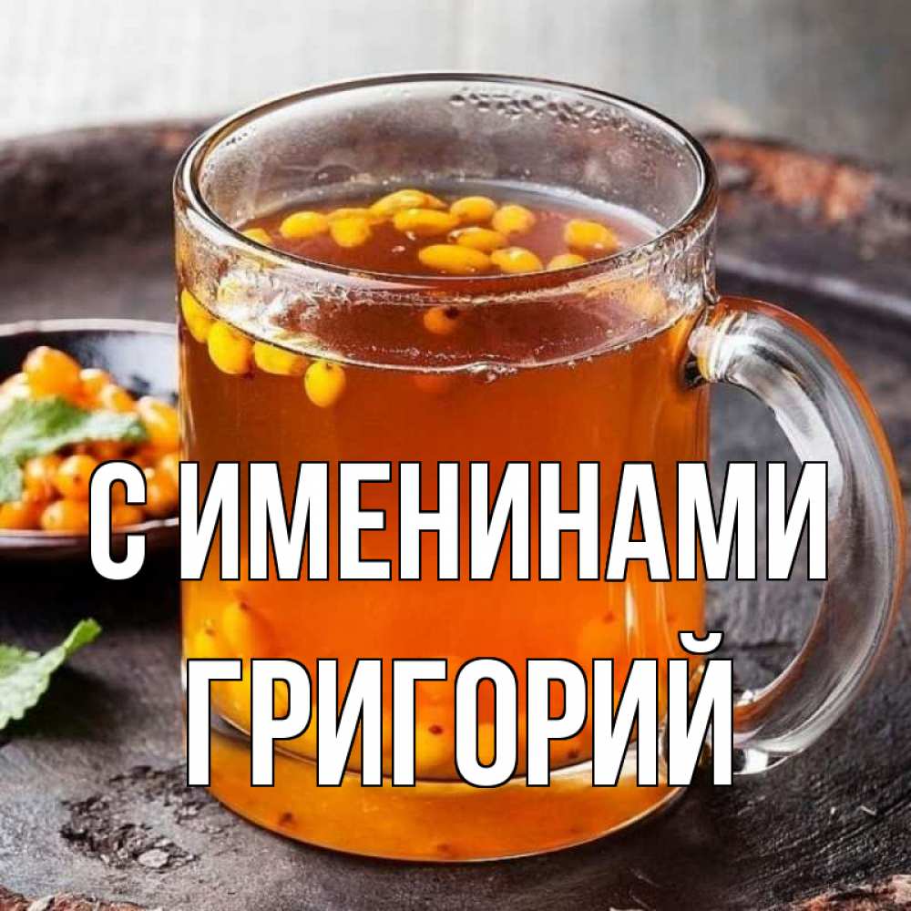 Открытка С именинами Григорий. облепиховый чай. лекарство от простуды