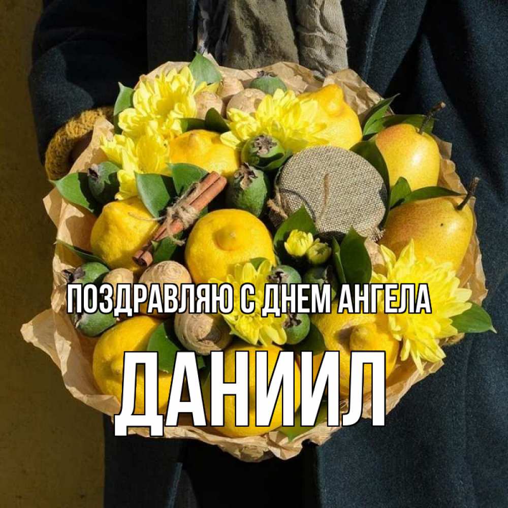 Открытка Поздравляю с днем Ангела Даниил. желтые цветы и лимоны. букет витаминов