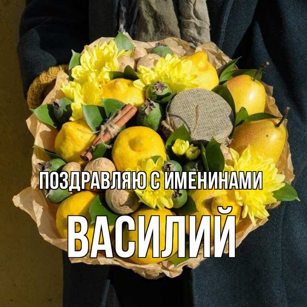 Открытка Поздравляю с именинами Василий. желтые цветы и лимоны. букет витаминов