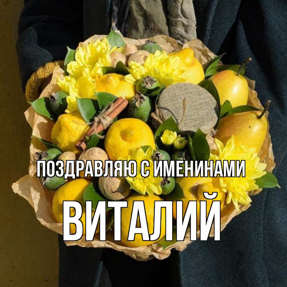 Открытка Поздравляю с именинами Виталий. желтые цветы и лимоны. букет витаминов